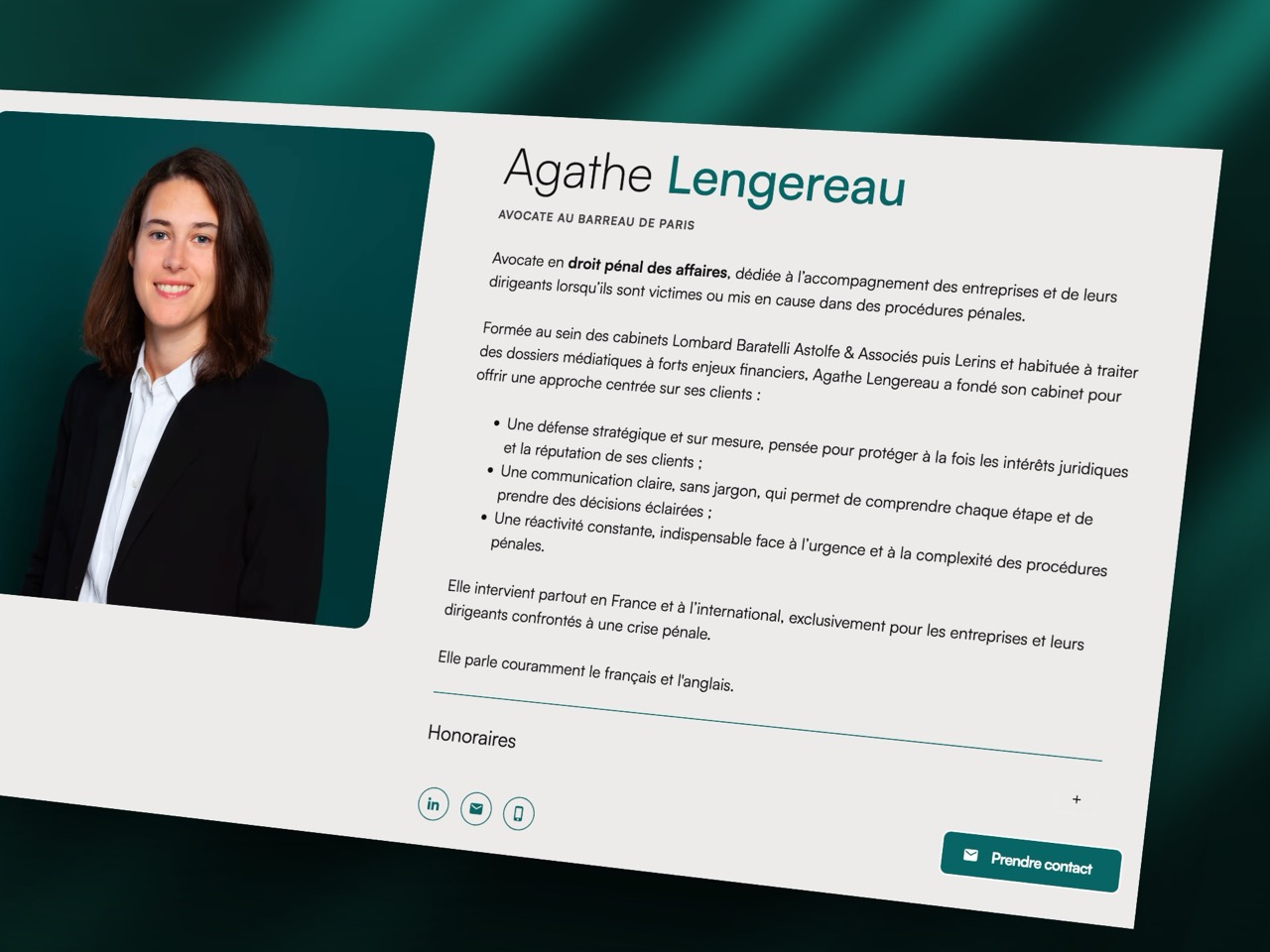 Maître Agtahe Lengereau souhaitait un site à son image, sobre, précis et immédiatement compréhensible pour les dirigeants et les entreprises confrontés à des situations de crise pénale.