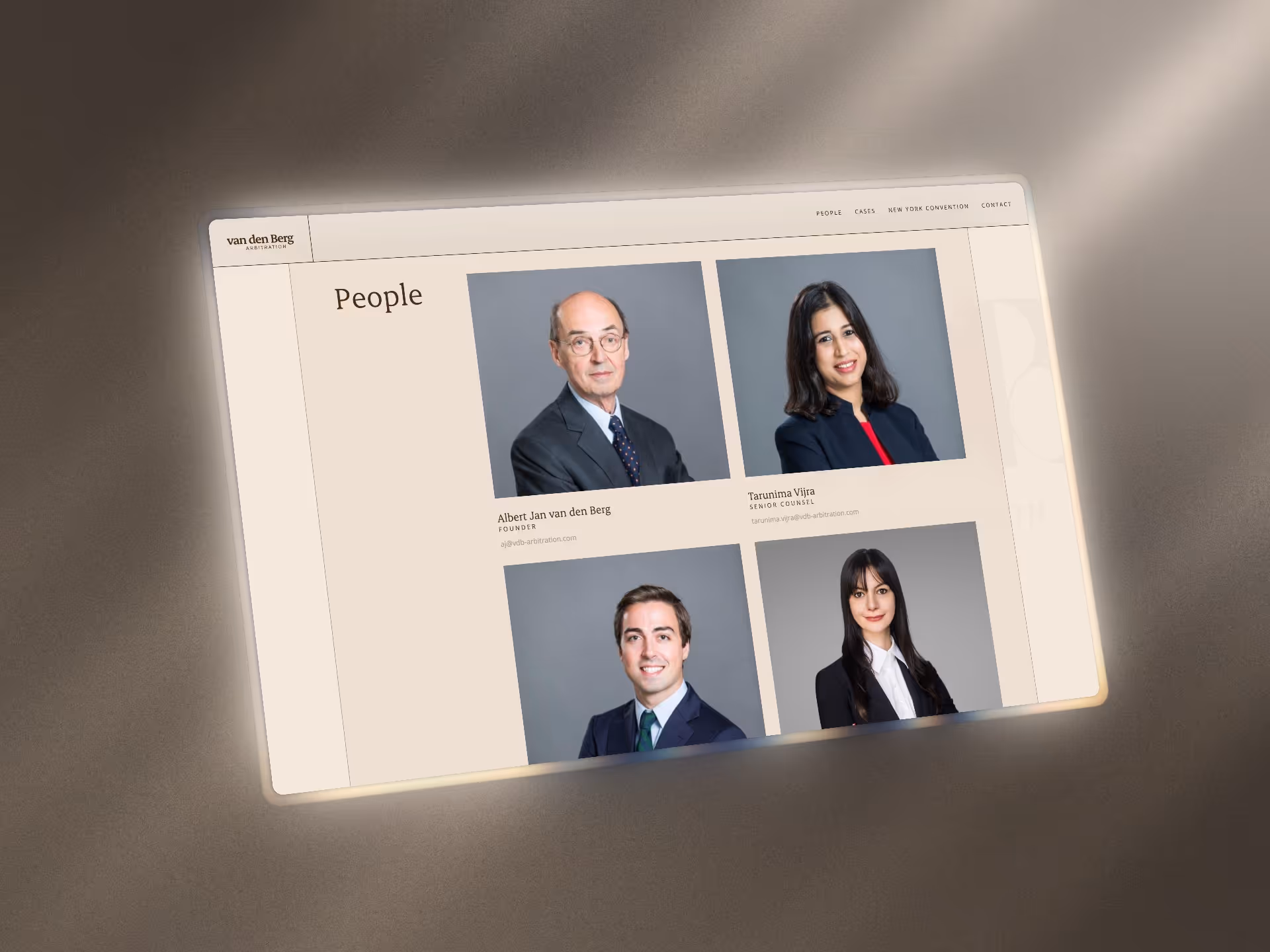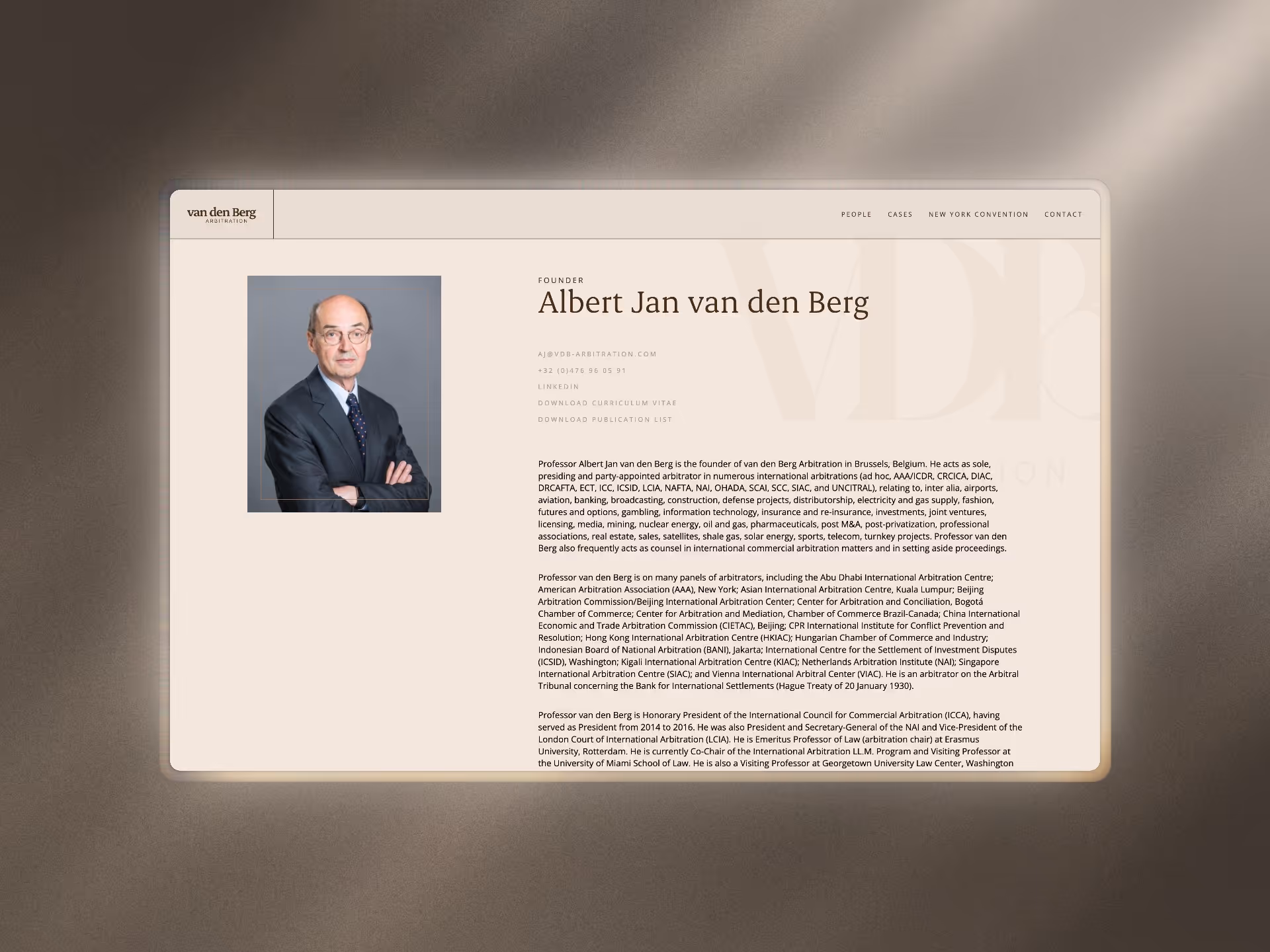 When the firm asked us, the request was clear: create a site extremely simple and uncluttered, which reflects their unique positioning. Where many structures multiply pages and contents, Vandenberg chooses restraint. Their strength lies in the absolute confidence in their reputation and their experience, which is already well established in the world of international arbitration.
