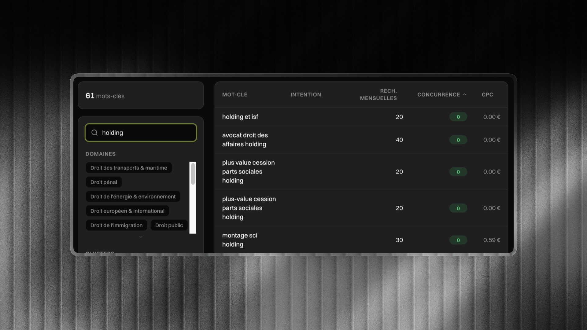 Décrivez vos domaines d'activité, l'outil fouille notre base et vous remonte les sujets les plus recherchés par vos clients potentiels. Plus de page blanche, plus d'articles écrits dans le vide.