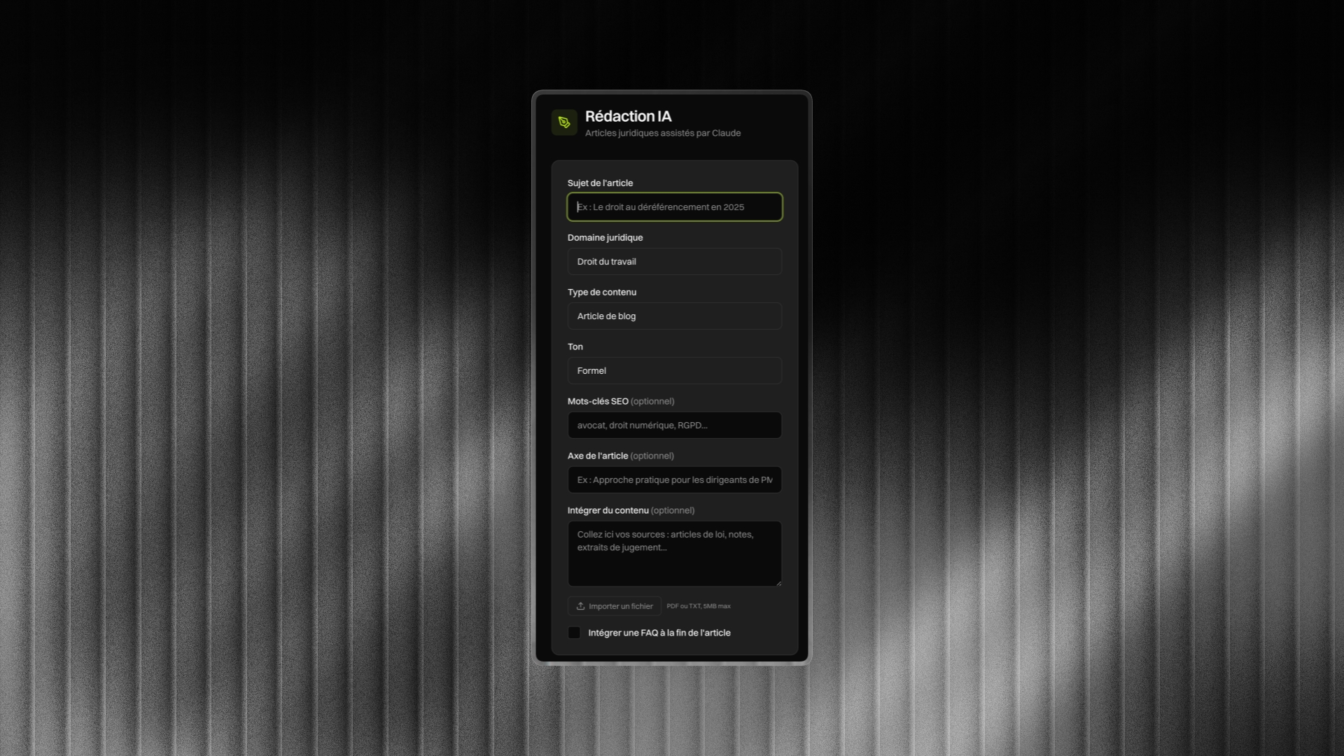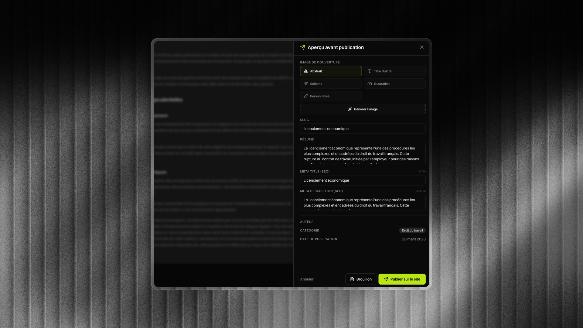 Le contenu est structuré et alimenté par l'API Legifrance et Claude. Il s'appuie donc sur des textes de référence à jour. Cela dit, aucun outil ne remplace votre regard d'expert. On le dit clairement : une relecture reste indispensable avant publication. Ce que l'outil fait, c'est prendre en charge le travail de fond, structure, optimisation, ancrage légal, pour que vous n'ayez plus qu'à valider et affiner.