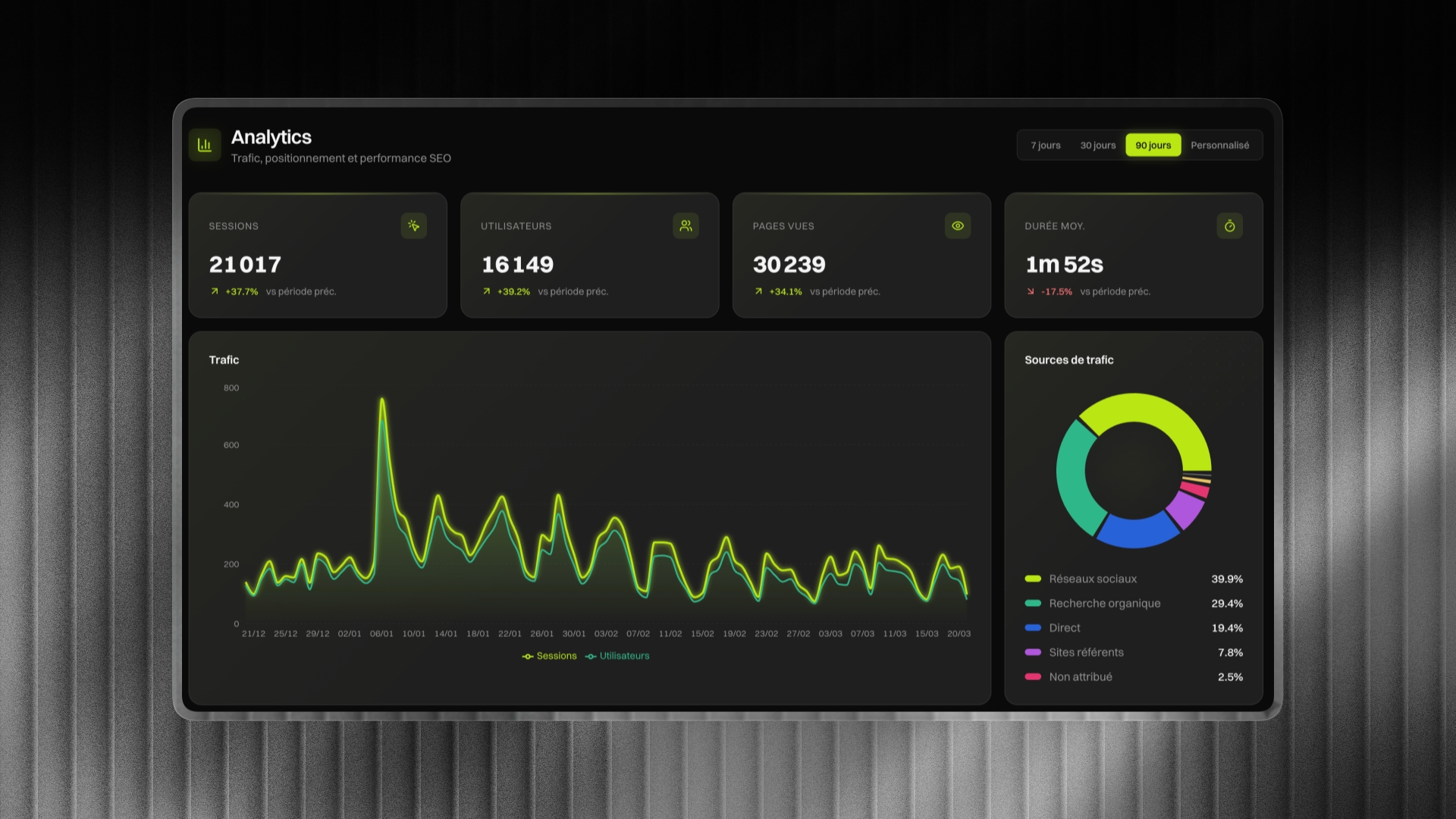 Le SEO est un investissement, pas une campagne publicitaire. Les premiers effets se mesurent généralement entre 3 et 6 mois après les premières publications. Ce qui change avec Espace OURAMA, c'est la vitesse d'exécution : là où produire 60 articles prenait des années, ça devient atteignable en quelques semaines. Plus vous publiez tôt, plus les résultats arrivent tôt.