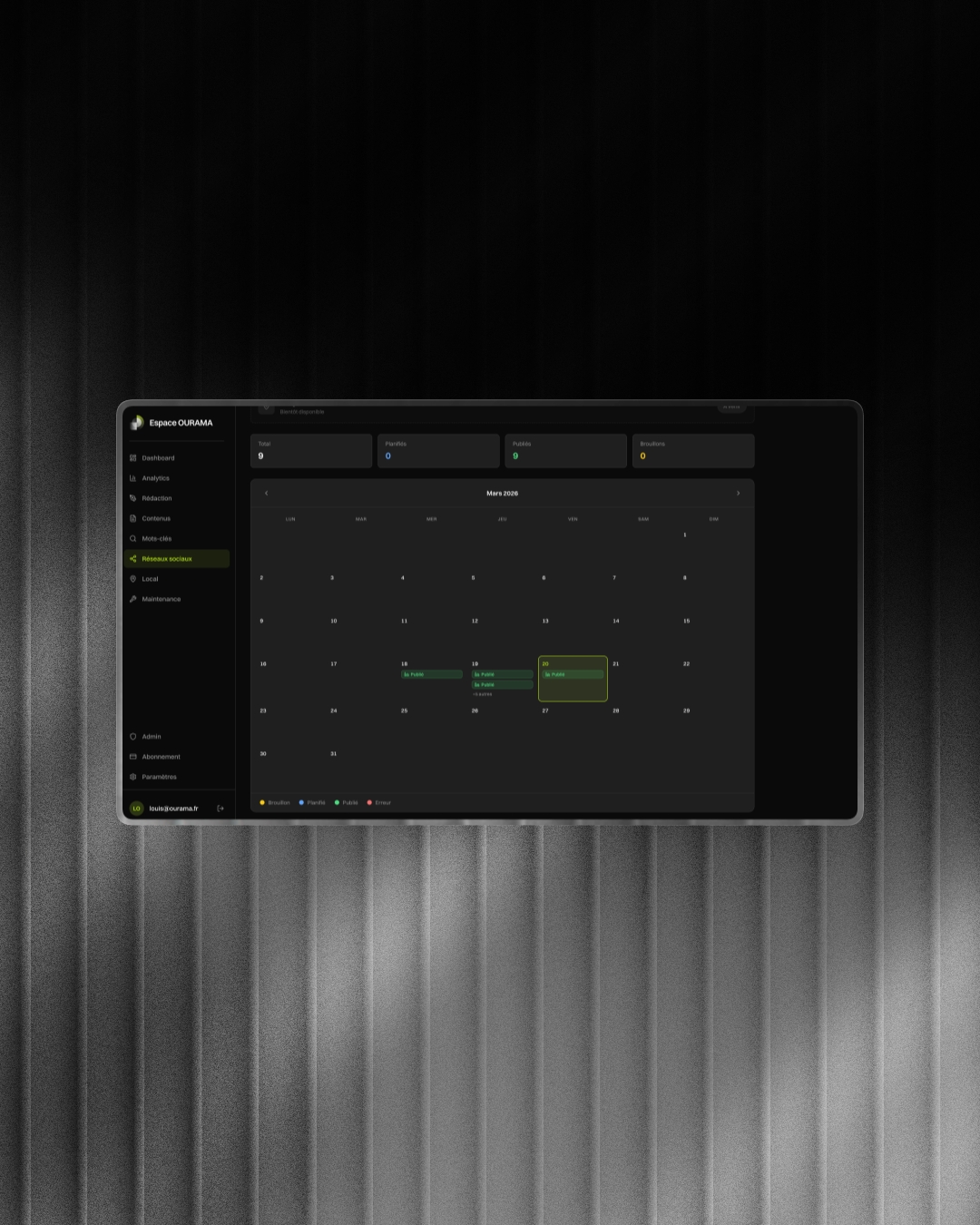 Espace OURAMA fonctionne avec des formules modulables selon vos besoins. Pas d'abonnement surdimensionné : vous activez les modules qui correspondent à votre usage, SEO, LinkedIn, avis Google, ou les trois. On vous présente les formules lors de la démo, une fois qu'on a compris ce dont vous avez vraiment besoin. Les premières formulent débute à 150€