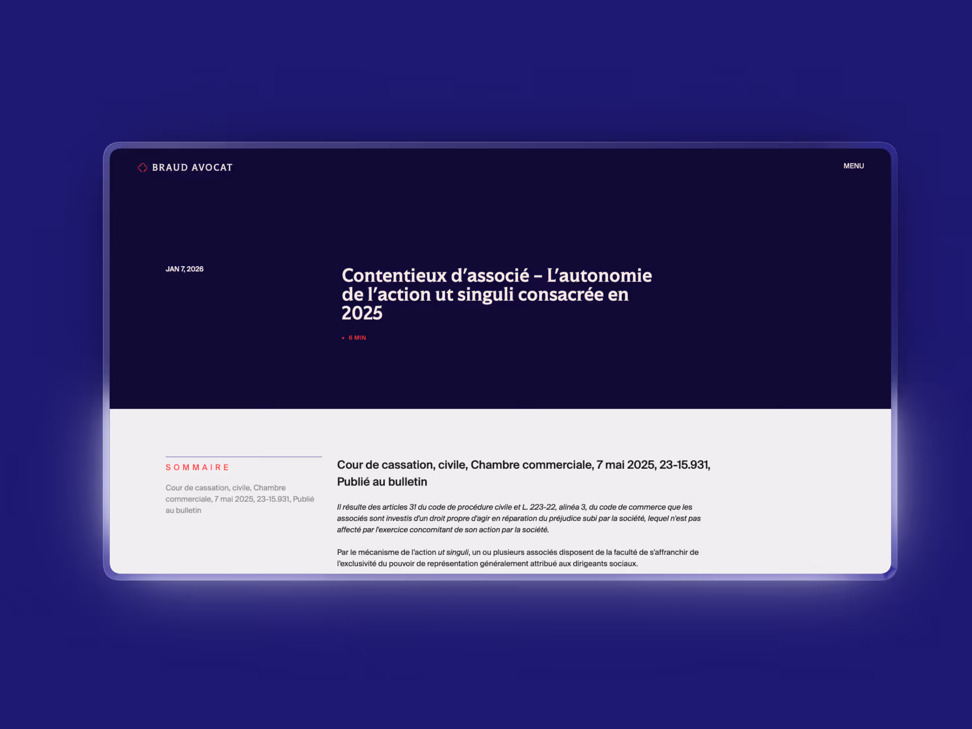 Nous avons intégré une section dédiée aux actualités juridiques, permettant au cabinet de publier régulièrement des analyses et décryptages. Des articles comme ceux consacrés à l'action ut singuli ou à la réforme du régime des nullités permettent à Braud Avocat de démontrer une veille active et une capacité à rendre accessibles des sujets complexes.
