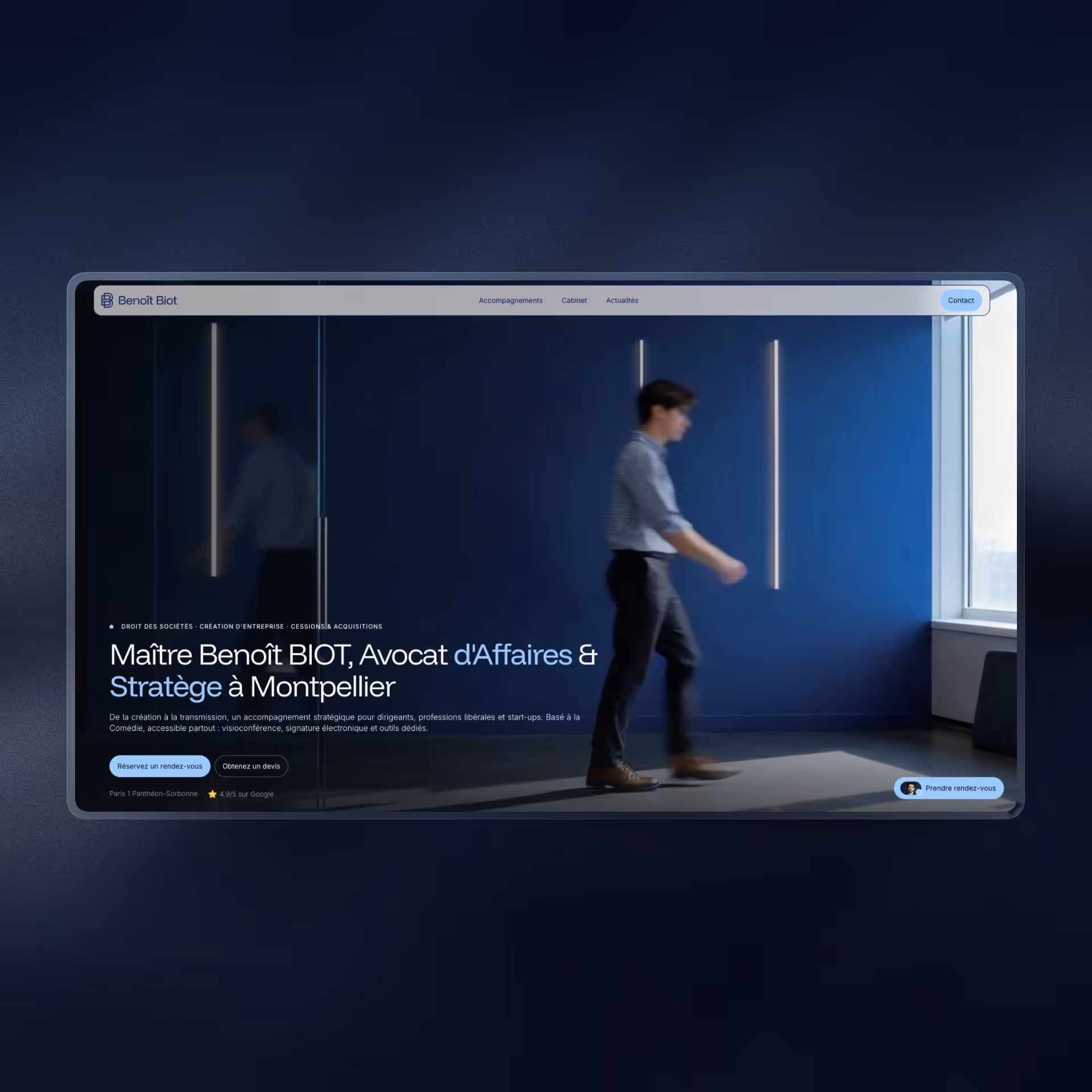 Ce parti pris est délibéré. Trop de cabinets d'affaires se ressemblent en ligne : mêmes tons bleus, mêmes photos de poignées de mains, mêmes mises en page génériques. Pour Braud Avocat, nous avons voulu créer une expérience visuelle qui capte l'attention dès les premières secondes et qui installe un niveau de perception élevé, à la mesure des dossiers traités par le cabinet.