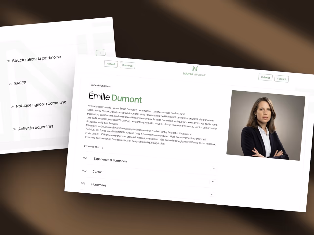 Contrairement à un site purement vitrine, Napta Avocat met l’accent sur la précision et la pédagogie. Chaque page combine contenu juridique détaillé et mise en forme lisible. Le résultat est un site riche mais aéré, fidèle à la posture du cabinet : rigueur, écoute et clarté.