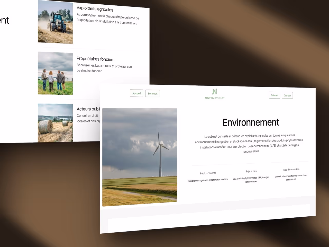 Napta Avocat disposait déjà d’un logo et d’une palette de couleurs. L’enjeu était donc de concevoir un design qui s’inscrive dans cette base graphique tout en modernisant l’ensemble. Le site repose sur des tons verts, blancs et noirs, pour un rendu à la fois pastel et professionnel. Les photographies, choisies avec soin, contribuent à créer un univers clair et ancré dans la réalité du monde agricole.