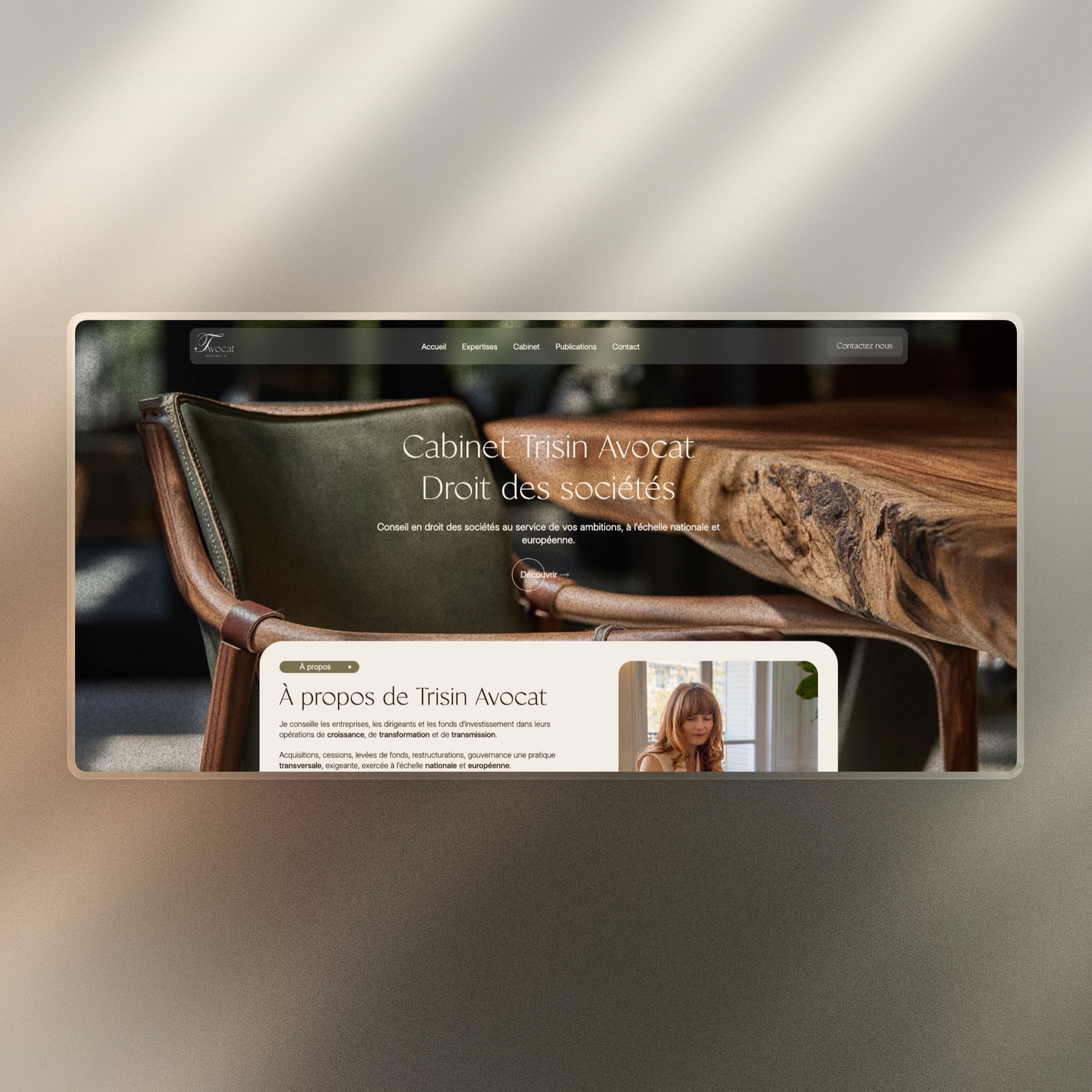 Le site d'Olga Trisin a été développé sur Webflow avec une architecture claire autour des cinq grandes étapes de la vie d'une entreprise. Chaque expertise dispose de sa page dédiée, construite pour que le dirigeant se projette immédiatement dans sa situation. Une FAQ répond aux questions concrètes qu'un dirigeant se pose avant de prendre rendez-vous : comment lancer une levée de fonds, combien de temps prévoir pour une cession, quelle structure choisir pour sa holding. Un espace publications est intégré pour alimenter le référencement naturel et permettre à Olga de capitaliser sur ses analyses juridiques au fil du temps.
