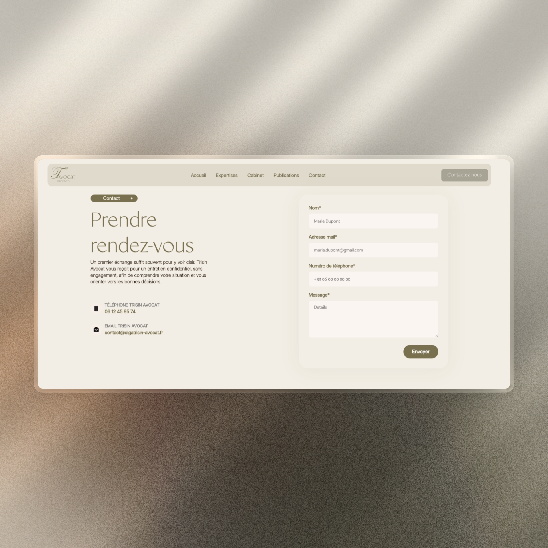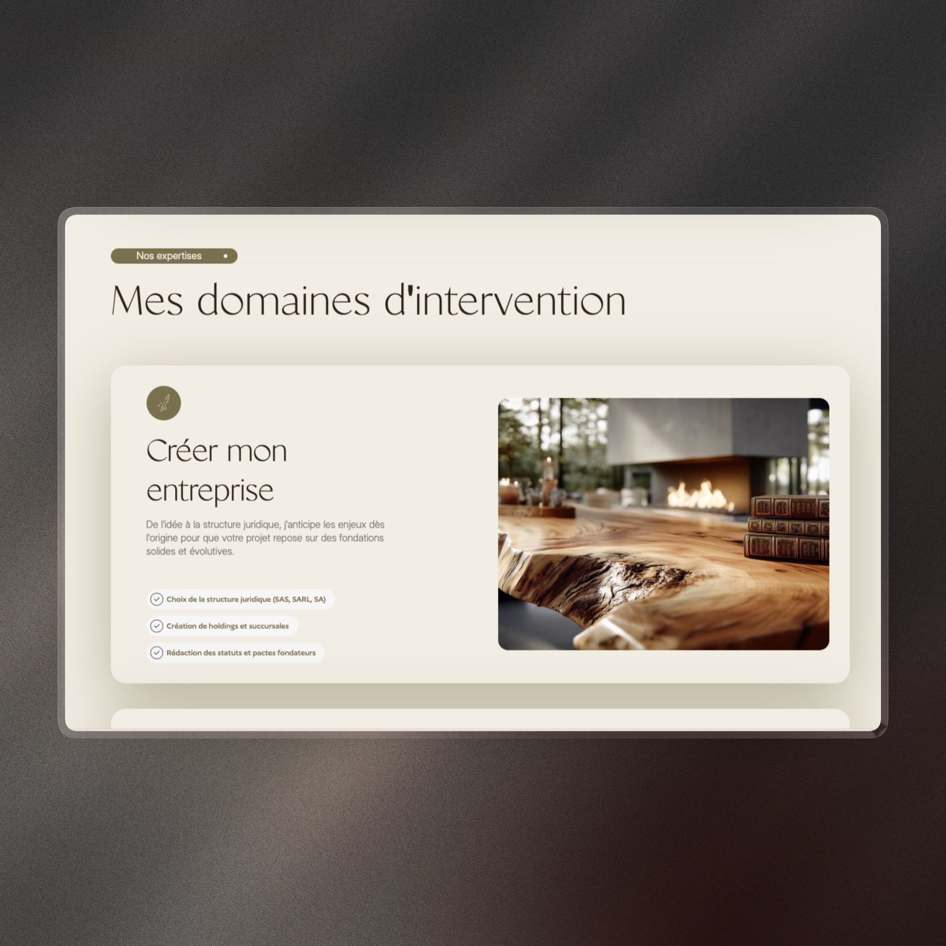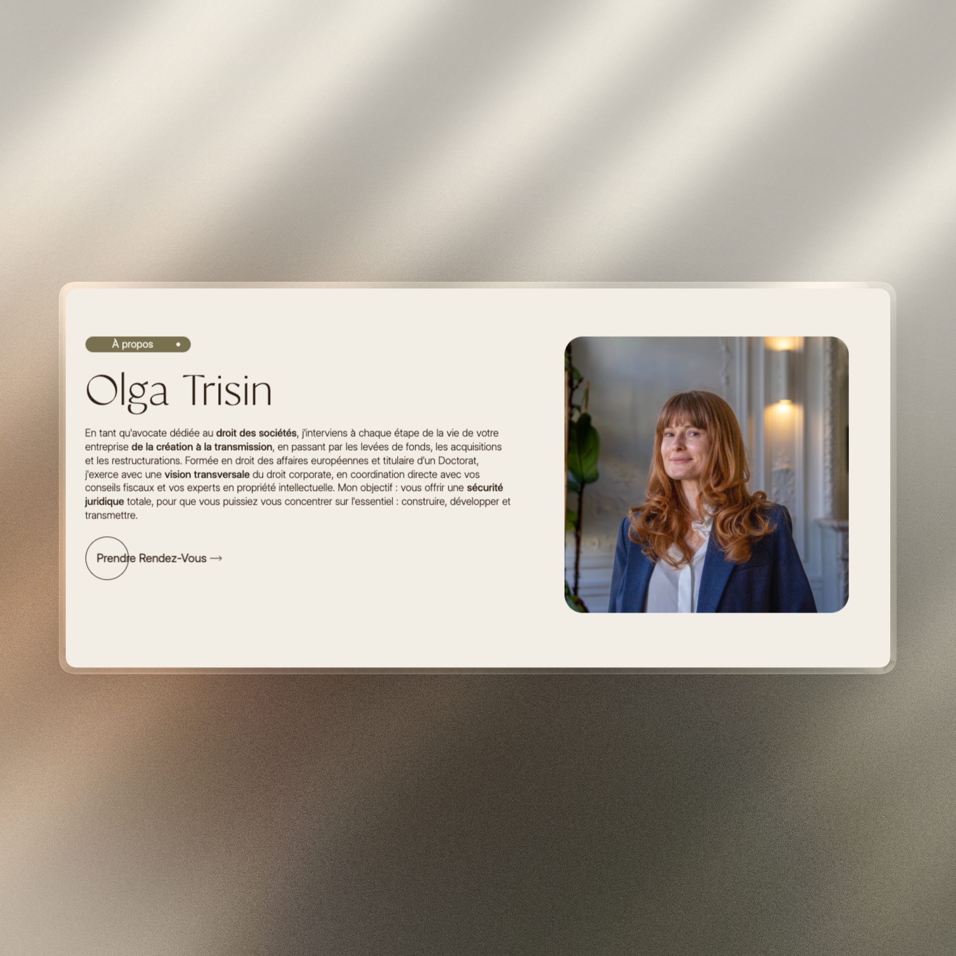 Tout part de la marque. Logo, palette chromatique, typographies, système visuel complet. L'univers graphique a été pensé pour traduire deux dimensions : la rigueur technique attendue d'une avocate qui intervient sur des opérations complexes, et la proximité relationnelle qu'Olga revendique auprès de ses clients. Des tons chauds et maîtrisés, des typographies élégantes, un résultat qui sort des codes habituels de la profession sans rien perdre en crédibilité.