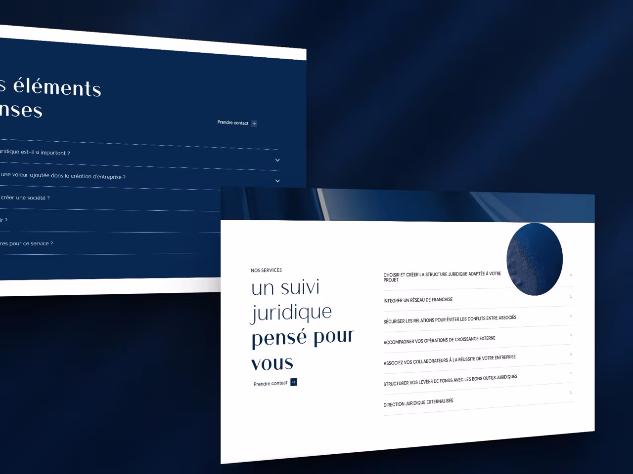 Le logo du cabinet a été modernisé pour symboliser une balance abstraite et élégante, en rupture avec la représentation classique de la justice. Cette refonte visuelle s’appuie sur une palette de bleu profond, blanc et noir, et des lignes sobres pour affirmer la dimension contemporaine et entrepreneuriale du cabinet.